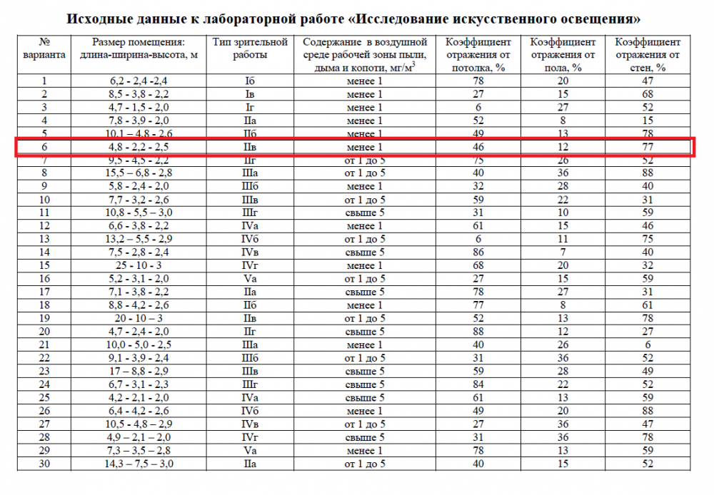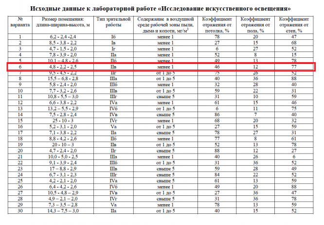 Рассчитать общее равномерное искусственное освещение для производственного помещения. Длина помещения, ширина, высота представлены в таблице. В помещении проводятся работы определенного разряда. В таблице также для каждого варианта представлено содержание в воздушной среде рабочей зоны пыли, дыма и копоти, коэффициенты отражения от потолка, стен и пола.
