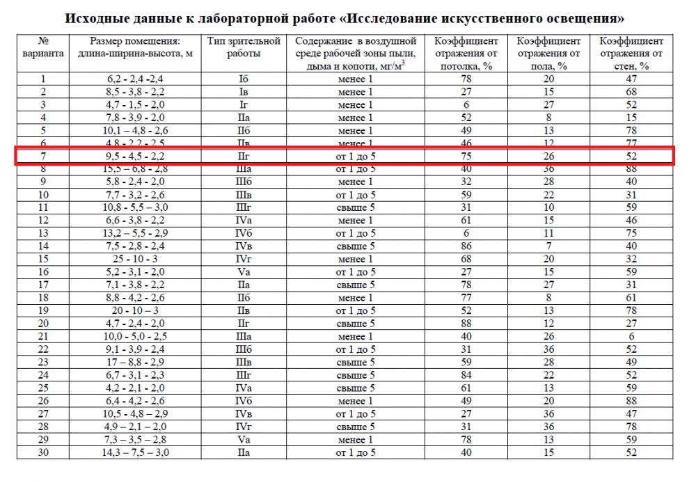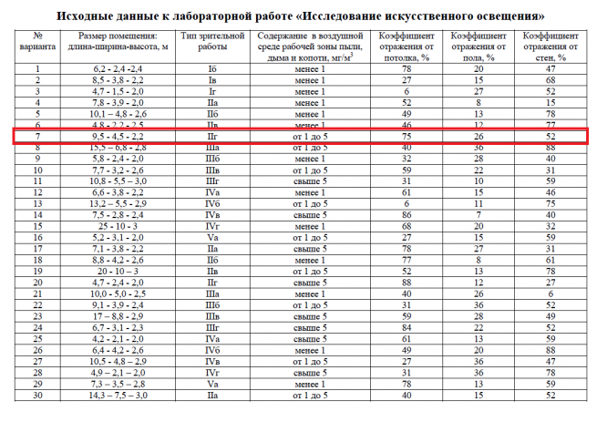 Рассчитать общее равномерное искусственное освещение для производственного помещения. Длина помещения, ширина, высота представлены в таблице. В помещении проводятся работы определенного разряда. В таблице также для каждого варианта представлено содержание в воздушной среде рабочей зоны пыли, дыма и копоти, коэффициенты отражения от потолка, стен и пола.