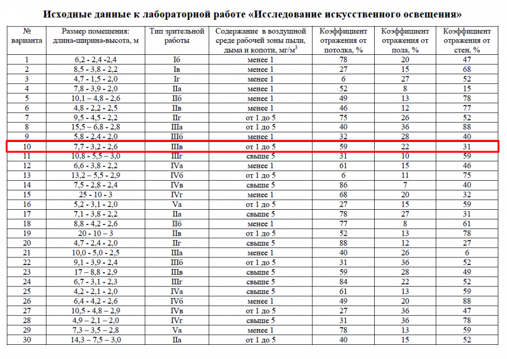 Рассчитать общее равномерное искусственное освещение для производственного помещения. Длина помещения, ширина, высота представлены в таблице. В помещении проводятся работы определенного разряда. В таблице также для каждого варианта представлено содержание в воздушной среде рабочей зоны пыли, дыма и копоти, коэффициенты отражения от потолка, стен и пола.