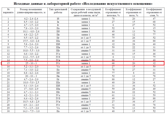 Рассчитать общее равномерное искусственное освещение для производственного помещения. Длина помещения, ширина, высота представлены в таблице. В помещении проводятся работы определенного разряда. В таблице также для каждого варианта представлено содержание в воздушной среде рабочей зоны пыли, дыма и копоти, коэффициенты отражения от потолка, стен и пола.