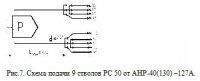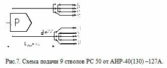 Задача: Расчет предельного расстояния подачи 9 стволов РС-50 (диаметром насадка 13 мм, напор у ствола 35 м. вод.ст.), если