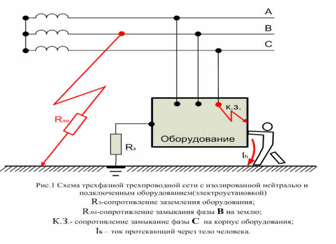 Главная » Учебные материалы » Безопасность жизнедеятельности (БЖД и ГРОБ или ОБЖ) » Решения задач » Несколько классов/семестров » В электрической сети (трехфазной трехпроводной, с изолированной нейтралью) напряжением 380/220 В фаза С вследствие повреждения изоляции оказалась замкнутой на корпус заземленной электроустановки, которой касается человек, а фаза В замкнулась на землю