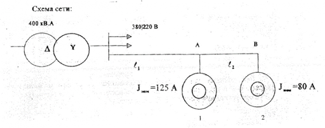 Проверить, обеспечена ли отключающая способность зануления в сети, при нулевом защитном проводнике – стальная полоса, сечением 40x4 мм. Линия 380/220 с проводами заданным сечением питается от трансформатора мощностью 400 кВА, 6.04 кВ, со схемой соединения обмоток треугольник/звезда. Двигатели защищены предохранителями Iном=125 А (двиг. 1)