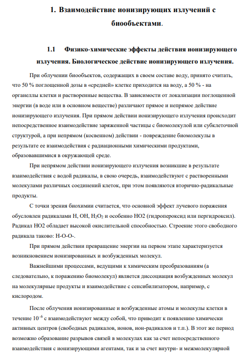 1.1Физико-химические эффекты действия ионизирующегоизлучения. Биологическое действие ионизирующего излучения.При облучении биообъектов, содержащих в своем составе воду, принято считать, что 50 % поглощенной дозы в «средней» клетке приходится на воду, а 50 % -на органеллы клетки и растворенные вещества. В зависимости от локализации поглощенной энергии (в воде или в основном веществе) различают прямое и непрямое действие ионизирующего излучения. При прямом действии ионизирующего излучения происходит непосредственное взаимодействие заряженной частицы с биомолекулой или субклеточной структурой, а при непрямом (косвенном) действии -повреждение биомолекулы в результате ее взаимодействия с радиационными химическими продуктами, образовавшимися в окружающей среде.При непрямом действии ионизирующего излучения возникшие в результате взаимодействия с водой радикалы, в свою очередь, взаимодействуют с растворенными молекулами различных соединений клеток, при этом появляются вторично-радикальные продукты.С точки зрения биохимии считается, что основной эффект лучевого поражения обусловлен радикалами Н, ОН, H2O2и особенно HO2 (гидропероксид или пергидроксил). Радикал HO2 обладает высокой окислительной способностью. Строение этого свободного радикала таково: H-O-O-. При прямом действии превращение энергии на первом этапе характеризуется возникновением ионизированных и возбужденных молекул.Важнейшими процессами, ведущими к химическим преобразованиям (а следовательно, к поражению биомолекул) является диссоциация возбужденных молекул на молекулярные продукты и взаимодействие с сенсибилизатором, например, с кислородом.После облучения ионизированные и возбужденные атомы и молекулы клетки в течение 10–6свзаимодействуют между собой, что приводит к появлению химически активных центров (свободных радикалов, ионов, ион-радикалов и т.п.). В этот же период возможно образование разрывов связей в молекулах как за счет непосредственного взаимодействия с ионизирующими агентами, так и за счет внутри-и межмолекулярной