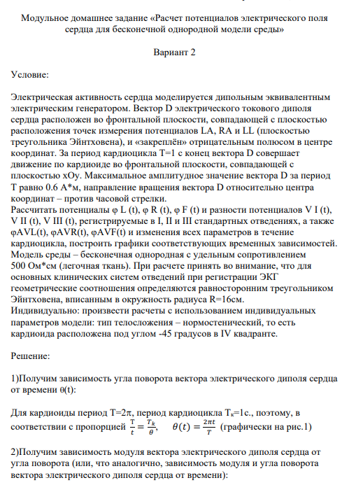 Электрическая активность сердца моделируется дипольным эквивалентным электрическим генератором. Вектор D электрического токового диполя сердца расположен во фронтальной плоскости, совпадающей с плоскостью расположения точек измерения потенциалов LA, RA и LL (плоскостью треугольника Эйнтховена), и «закреплён » отрицательным полюсом в центре координат. За период кардиоцикла Т=1 с конец вектора D совершает движение по кардиоиде во фронтальной плоскости, совпадающей с плоскостью xOy. Максимальное амплитудное значение вектора D за период Т равно 0.6 А*м, направление вращения вектора D относительно центра координат – против часовой стрелки. Рассчитать потенциалы φ L (t), φ R (t), φ F (t) и разности потенциалов V I (t), V II (t), V III (t), регистрируемые в I, II и III стандартных отведениях, а также φAVL(t), φAVR(t), φAVF(t) и изменения всех параметров в течение кардиоцикла, построить графики соответствующих временных зависимостей. Модель среды – бесконечная однородная с удельным сопротивлением 500 Ом*см (легочная ткань). При расчете принять во внимание, что для основных клинических систем отведений при регистрации ЭКГ геометрические соотношения определяются равносторонним треугольником Эйнтховена, вписанным в окружность радиуса R=16см. Индивидуально: произвести расчеты с использованием индивидуальных параметров модели: тип телосложения – нормостенический, то есть кардиоида расположена под углом -45 градусов в IV квадранте.