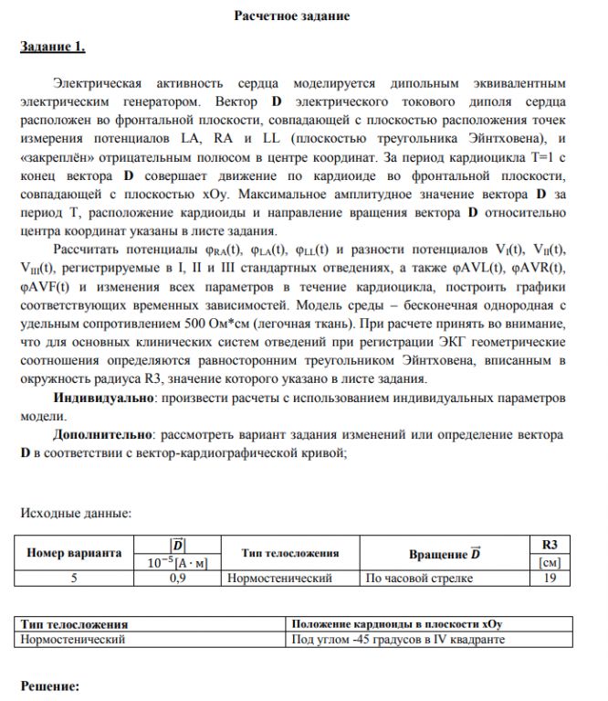 Электрическая активность сердца моделируется дипольным эквивалентным электрическим генератором. Вектор D электрического токового диполя сердца расположен во фронтальной плоскости, совпадающей с плоскостью расположения точек измерения потенциалов LA, RA и LL (плоскостью треугольника Эйнтховена), и «закреплён » отрицательным полюсом в центре координат. За период кардиоцикла Т=1 с конец вектора D совершает движение по кардиоиде во фронтальной плоскости, совпадающей с плоскостью xOy. Максимальное амплитудное значение вектора D за период Т, расположение кардиоиды и направление вращения вектора D относительно центра координат указаны в листе задания. Рассчитать потенциалы φRA(t), φLA(t), φLL(t) и разности потенциалов VI(t), VII(t), VIII(t), регистрируемые в I, II и III стандартных отведениях, а также φAVL(t), φAVR(t), φAVF(t) и изменения всех параметров в течение кардиоцикла, построить графики соответствующих временных зависимостей. Модель среды – бесконечная однородная с удельным сопротивлением 500 Ом*см (легочная ткань). При расчете принять во внимание, что для основных клинических систем отведений при регистрации ЭКГ геометрические соотношения определяются равносторонним треугольником Эйнтховена, вписанным в окружность радиуса R3, значение которого указано в листе задания. Индивидуально: произвести расчеты с использованием индивидуальных параметров модели. Дополнительно: рассмотреть вариант задания изменений или определение вектора D в соответствии с вектор-кардиографической кривой;
