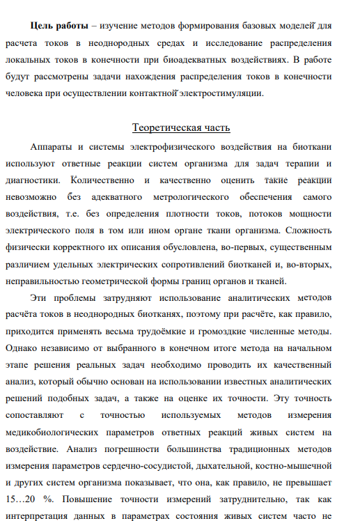 Аппараты и системы электрофизического воздействия на биоткани используют ответные реакции систем организма для задач терапии и диагностики. Количественно и качественно оценить такие реакции невозможно без адекватного метрологического обеспечения самого воздействия, т.е. без определения плотности токов, потоков мощности электрического поля в том или ином органе ткани организма. Сложность физически корректного их описания обусловлена, во-первых, существенным различием удельных электрических сопротивлений биотканей и, во-вторых, неправильностью геометрической формы границ органов и тканей.