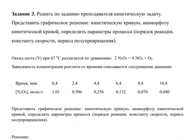 Задание 3. Решить по заданию преподавателя кинетическую задачу. Представить графическое решение: кинетическую кривую, анаморфозу кинетической кривой, определить параметры процесса (порядок реакции, константу скорости, период полупревращения)