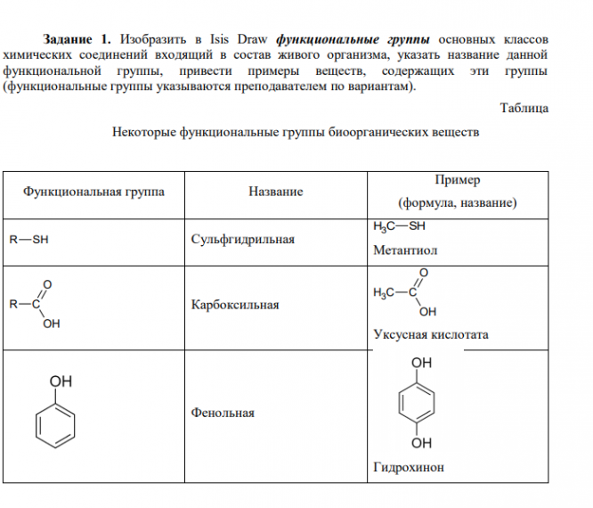Задание 1. Изобразить в Isis Draw функциональные группы основных классов химических соединений входящий в состав живого организма, указать название данной функциональной группы, привести примеры веществ, содержащих эти группы (функциональные группы указываются преподавателем по вариантам).