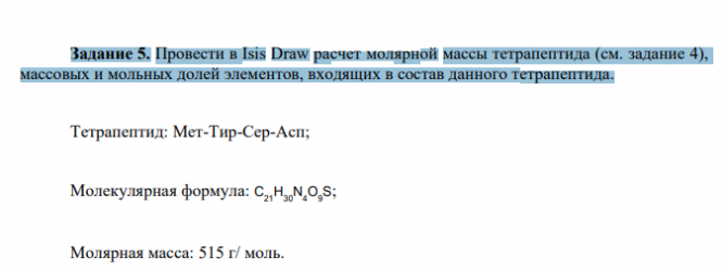 Задание 5. Провести в Isis Draw расчет молярной массы тетрапептида (см. задание 4), массовых и мольных долей элементов, входящих в состав данного тетрапептида.