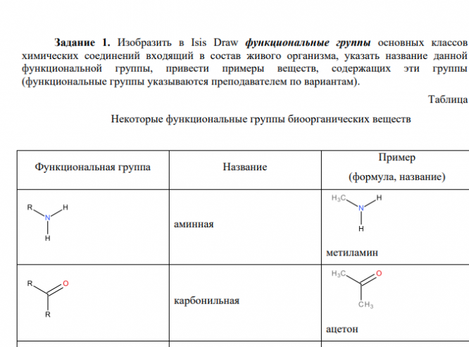 Задание 1. Изобразить в Isis Draw функциональные группы основных классов химических соединений входящий в состав живого организма, указать название данной функциональной группы, привести примеры веществ, содержащих эти группы (функциональные группы указываются преподавателем по вариантам).