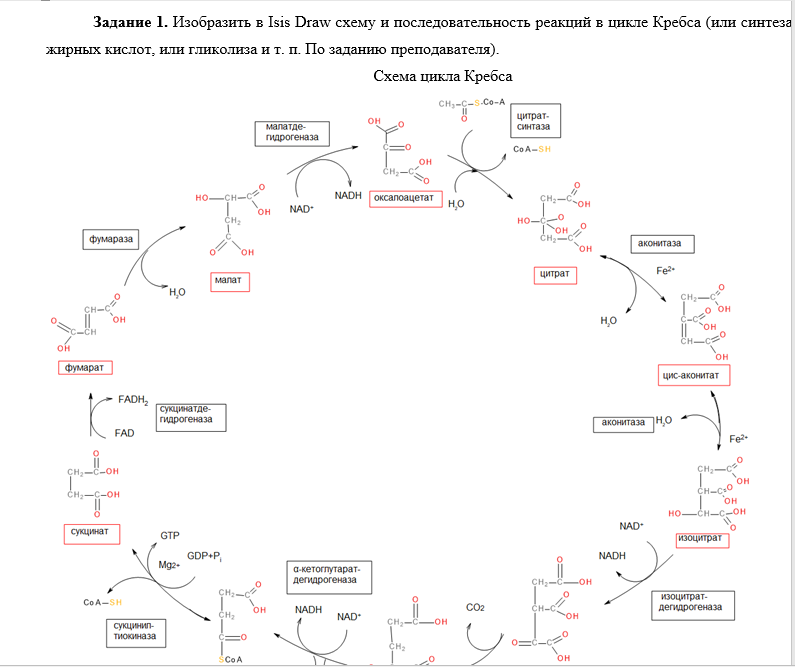 Задание 1. Изобразить в Isis Draw схему и последовательность реакций в цикле Кребса (или синтеза жирных кислот, или гликолиза и т. п. По заданию преподавателя).