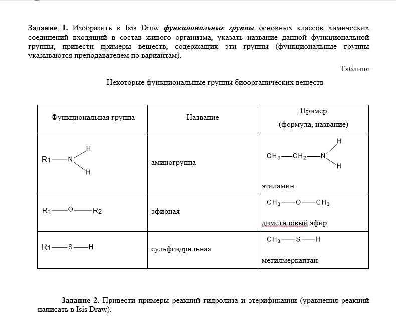 Задание 1. Изобразить в Isis Draw функциональные группы основных классов химических соединений входящий в состав живого организма, указать название данной функциональной группы, привести примеры веществ, содержащих эти группы (функциональные группы указываются преподавателем по вариантам).