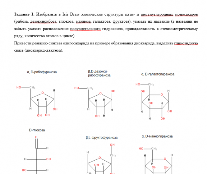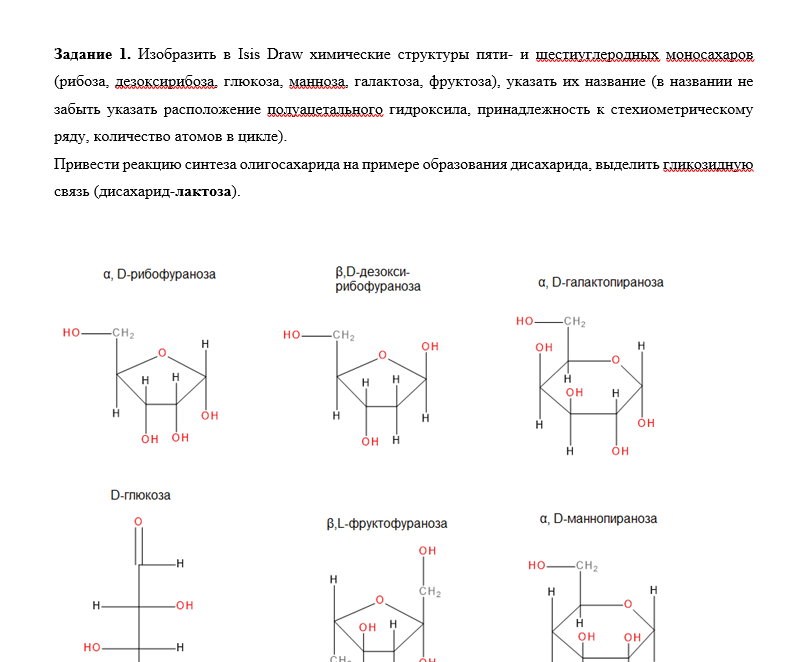 Задание 1. Изобразить в Isis Draw химические структуры пяти- и шестиуглеродных моносахаров (рибоза, дезоксирибоза, глюкоза, манноза, галактоза, фруктоза), указать их название (в названии не забыть указать расположение полуацетального " target="_blank" title="Химическая энциклопедия" rel="noopener external noreferrer">гидроксила, принадлежность к стехиометрическому ряду, количество атомов в цикле).