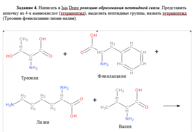 Задание 4. Написать в Isis Draw реакцию образования пептидной связи. Представить цепочку из 4-х аминокислот (тетрапептид), выделить пептидные группы, назвать тетрапептид (Треонин-фенилаланин-лизин-валин).