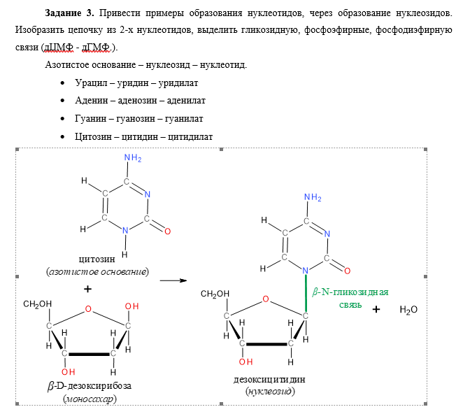 Задание 3. Привести примеры образования нуклеотидов, через образование нуклеозидов. Изобразить цепочку из 2-х нуклеотидов, выделить гликозидную, фосфоэфирные, фосфодиэфирную связи (дЦМФ - дГМФ.).