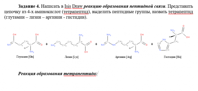 Задание 4. Написать в Isis Draw реакцию образования пептидной связи. Представить цепочку из 4-х аминокислот (тетрапептид), выделить пептидные группы, назвать тетрапептид (Треонин-фенилаланин-лизин-валин).