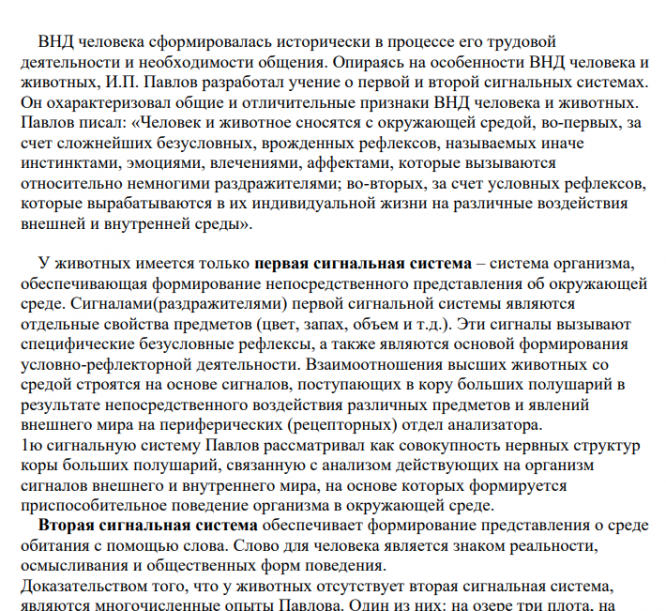 ВНД человека сформировалась исторически в процессе его трудовой деятельности и необходимости общения. Опираясь на особенности ВНД человека и животных, И.П. Павлов разработал учение о первой и второй сигнальных системах. Он охарактеризовал общие и отличительные признаки ВНД человека и животных. Павлов писал: «Человек и животное сносятся с окружающей средой, во-первых, за счет сложнейших безусловных, врожденных рефлексов, называемых иначе инстинктами, эмоциями, влечениями, аффектами, которые вызываются относительно немногими раздражителями; во-вторых, за счет условных рефлексов, которые вырабатываются в их индивидуальной жизни на различные воздействия внешней и внутренней среды».