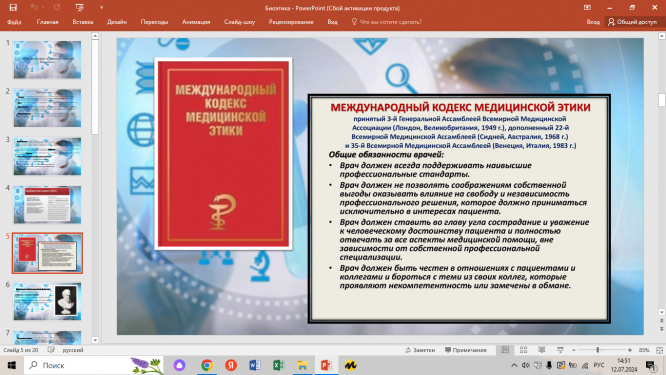 В медицине существует такая необходимая наука как «биоэтика», которая охватывает сферу права, этики и справедливости, а также нравственного аспекта деятельности человека в медицине и биологии.