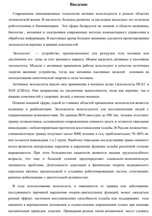 Современные инновационные технологии активно используются в разных областях человеческой жизни. В частности, большое развитие за последние несколько лет получили робототехника и биоинженерия. Эти сферы базируется на знаниях в области медицины, биологии , механики и электроники современных методах компьютерного управления и обработки информации. В настоящее время большое внимание уделяется проектированию экзоскелетов верхних и нижних конечностей. Экзоскелет — устройство, предназначенное для разгрузки тела человека или увеличения его силы за счет внешнего каркаса. Можно выделить активные и пассивные экзоскелеты. Модели с активным принципом работы используют в качестве источника энергии внешние устройства, тогда как механика пассивных моделей основана на использовании кинетической энергии и силы человека. Активные экзоскелеты нашли свое применение в военных целях (экзоскелеты HULC и XOS (США)). Они направлены на увеличение выносливости, силы как верхних, так и нижних конечностей у здоровых людей, а именно военных.