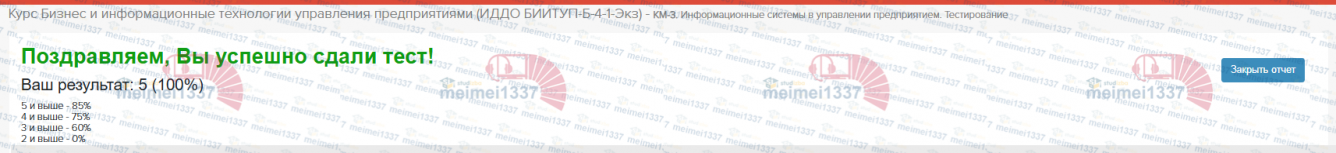 Для студентов ИДДО НИУ «МЭИ» по предмету Бизнес и информационные технологии управления предприятиямиБизнес и информационные технологии управления предприятиями - КМ-3. Информационные системы в управлении предприятием. ТестированиеБизнес и информационные технологии управления предприятиями - КМ-3. Информационные системы в управлении предприятием. Тестирование