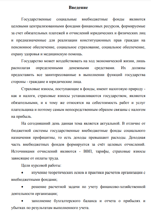 Цели курсовой работы: изучение теоретических основ и практики расчетов организации с внебюджетными фондами; решение расчетной задачи по учету финансово-хозяйственной деятельности организации; заполнение бухгалтерского баланса и отчета о прибылях и убытках по результатам выполненного учета