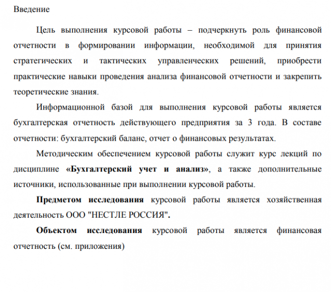 Цель выполнения курсовой работы – подчеркнуть роль финансовой отчетности в формировании информации, необходимой для принятия стратегических и тактических управленческих решений, приобрести практические навыки проведения анализа финансовой отчетности и закрепить теоретические знания. Информационной базой для выполнения курсовой работы является бухгалтерская отчетность действующего предприятия за 3 года. В составе отчетности: бухгалтерский баланс, отчет о финансовых результатах. Методическим обеспечением курсовой работы служит курс лекций по дисциплине «Бухгалтерский учет и анализ», а также дополнительные источники, использованные при выполнении курсовой работы. Предметом исследования курсовой работы является хозяйственная деятельность ООО "НЕСТЛЕ РОССИЯ". Объектом исследования курсовой работы является финансовая отчетность (см. приложения)