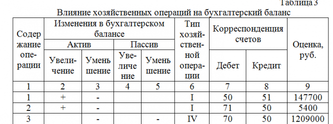 - определить характер влияния на бухгалтерский баланс каждой хозяйственной операции, содержащейся в табл.2. Результаты внести в колонки 1-5, 9 табл.3.