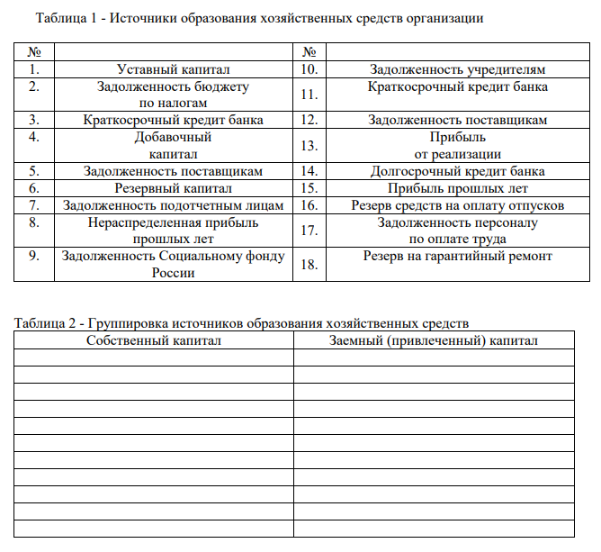 По данным условия (таблица 1) сгруппировать источники средств организации на собственные и привлеченные, результат записать в таблице 2.