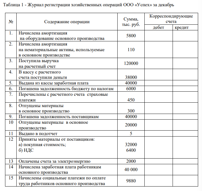 По данным журнала регистрации хозяйственных операций (таблица 1) составить корреспонденции счетов.