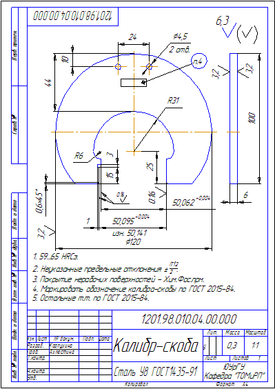 Калибр-скоба 50 мм. Чертёж курсовой либо расчётно-графической работы.