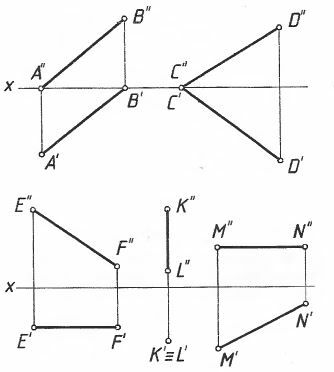 Задача: 10. Определить положение заданных отрезков относительно плоскостей проекций. Найти следы прямых, которым