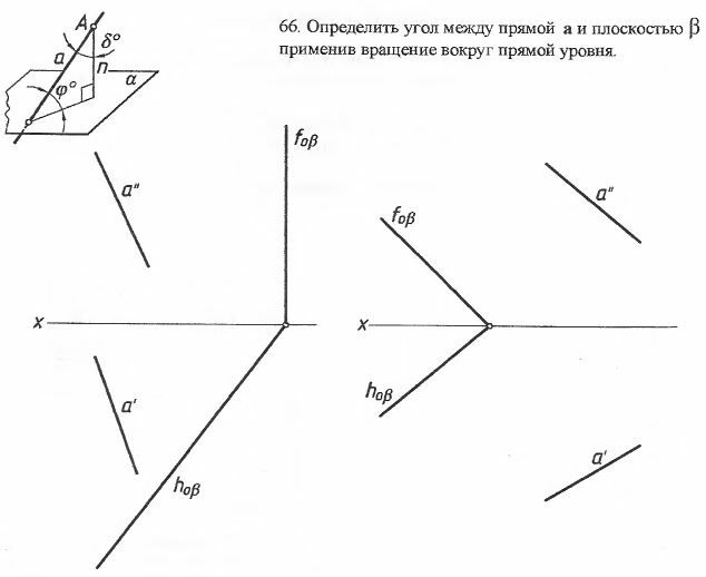 66. Определить угол между прямой а и плоскостью β,применив вращение вокруг прямой уровня.