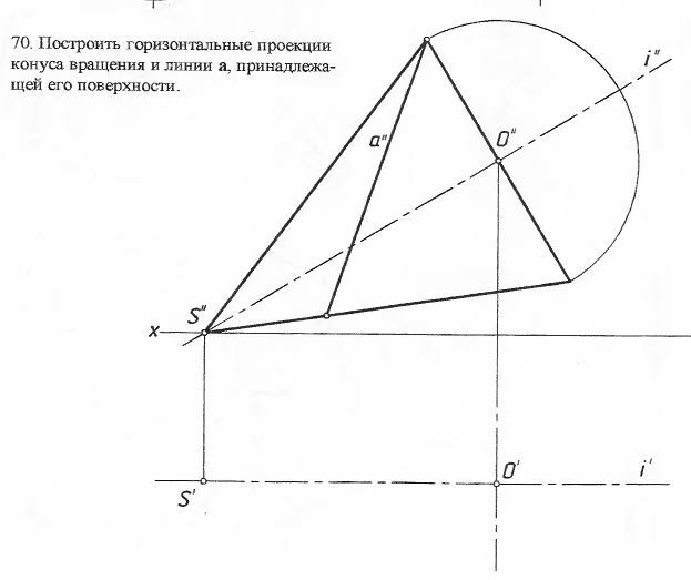 Задача: 70. Построить горизонтальные проекции конуса вращения и линии а, принадлежащей его