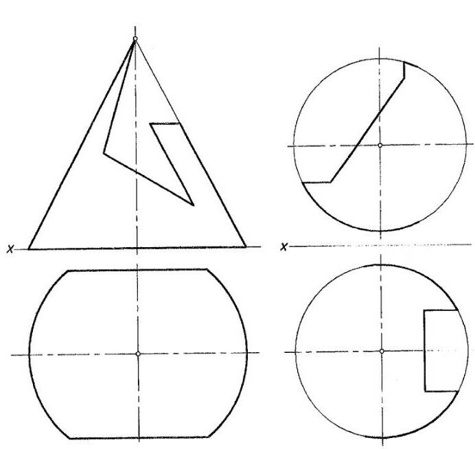 71. Достроить проекции конуса и шара, усечённых проецирующими плоскостями.