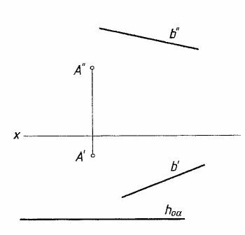 Задача: 81. Построить проекции прямых, проходящих через точку А, пересекающих прямую b и наклонённых к плоскости α