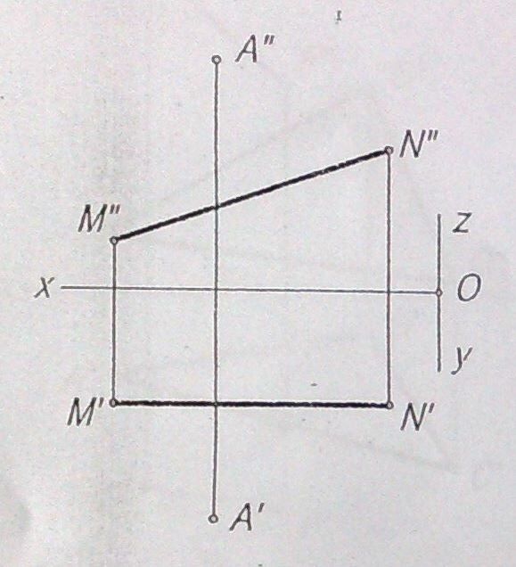 Построить равносторонний треугольник ABC со стороной BC на прямой MN. Определить углы наклона высоты и плоскости треугольника к плоскостям проекций.