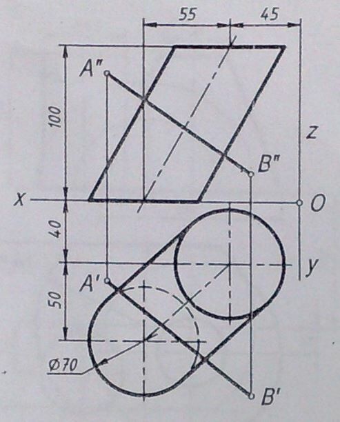 Для студентов по предмету ЧерчениеЗадача 5. Вариант 14.1. Найти точки пересечения прямой АВ с заданными поверхностями.2. Построить касательнуюЗадача 5. Вариант 14.1. Найти точки пересечения прямой АВ с заданными поверхностями.2. Построить касательную