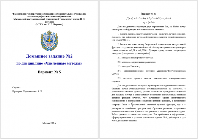 Для каждого метода построить траекторию последовательности точек (нанести точки релаксационной последовательности на плоскость с указанными линиями уровня), указать количество проведенных итераций для каждого метода и эквивалентное количество вычисленных значений целевой функции (считать, что вычисление одного антиградиента эквивалентно n вычислениям значений целевой функции, а вычисление матрицы Гессе – вычислений значений целевой функции, где n – размерность линейного пространства). Сравнить решения, полученные различными методами. Сравнить эти решения с точным решением задачи. Работа должна заканчиваться выводами. Все требования к оформлению, сформулированные в условии домашнего задания No1, действуют и для этого домашнего задания.