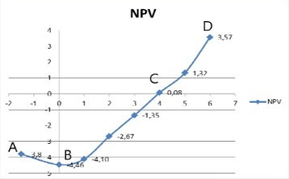 Ниже приведен график чистой приведенной стоимости проекта NPV. В какой точке графика наступает окупаемость проекта?