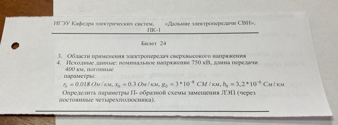 Главная » Учебные материалы » Дальние линии электропередачи СВН » Решения задач » ИГЭУ им. Ленина » 8 семестр » Номер 1 » Вариант 24 » Области применения электропередач сверхвысокого напряжения. Определить параметры П- образной схемы замещения ЛЭП (через постоянные четырехполюсника).
