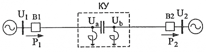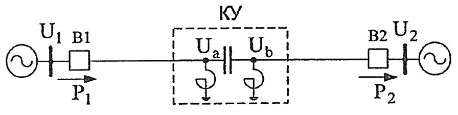 ЛЭП может работать в двух режимах: с устройством компенсации и без него. Компенсирующее устройство (КУ) состоит из устройства продольной компенсации (УПК) и реактора поперечной компенсации (РПК). Реактор задан мощностью , а устройство продольной компенсации – степенью компенсации l.