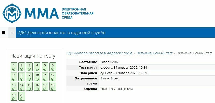 Сборник ответов к экзаменационному тесту Делопроизводство в кадровой службе ММА.