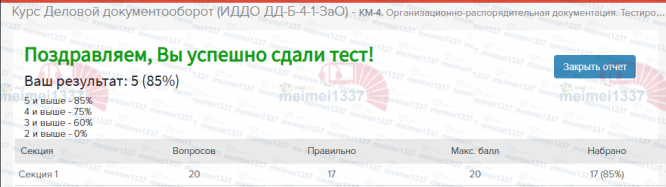 Курс Деловой документооборот - КМ-4. Организационно-распорядительная документация. Тестирование - 85%