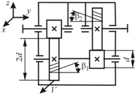 • Изобразить промежуточный вал с колёсами (быстроходная ступень прямозубая, а тихоходная косозубая). Нанести векторы сил, нагружающих эти зубья. Написать формулы для вычисления этих сил. Определить эти силы, если крутящий момент на промежуточном валу равен T, а d и 2d – диаметры делительных окружностей шестерни и колеса, γ1 − угол делительного конуса конической шестерни. V − вектор скорости.