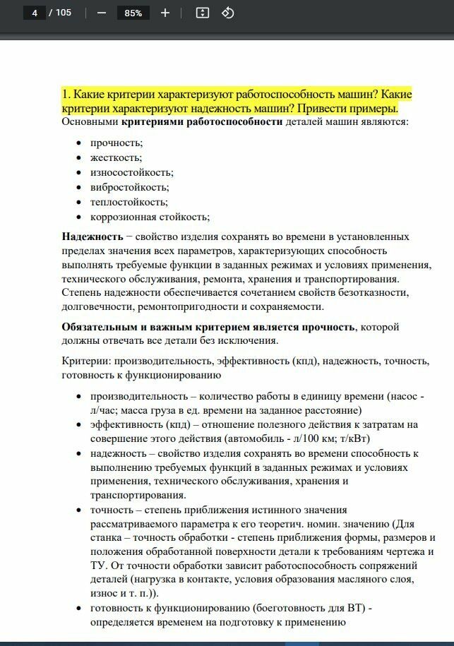 1. Какие критерии характеризуют работоспособность машин? Какие критерии характеризуют надежность машин? Привести примеры. Основными критериями работоспособности деталей машин являются:  прочность;  жесткость;  износостойкость;  вибростойкость;  теплостойкость;  коррозионная стойкость; Надежность − свойство изделия сохранять во времени в установленных пределах значения всех параметров, характеризующих способность выполнять требуемые функции в заданных режимах и условиях применения, технического обслуживания, ремонта, хранения и транспортирования. Степень надежности обеспечивается сочетанием свойств безотказности, долговечности, ремонтопригодности и сохраняемости. Обязательным и важным критерием является прочность, которой должны отвечать все детали без исключения. Критерии: производительность, эффективность (кпд), надежность, точность, готовность к функционированию  производительность – количество работы в единицу времени (насос - л/час; масса груза в ед. времени на заданное расстояние)  эффективность (кпд) – отношение полезного действия к затратам на совершение этого действия (автомобиль - л/100 км; т/кВт)  надежность – свойство изделия сохранять во времени способность к выполнению требуемых функций в заданных режимах и условиях применения, технического обслуживания, хранения и транспортирования.  точность – степень приближения истинного значения рассматриваемого параметра к его теоретич. номин. значению (Для станка – точность обработки - степень приближения формы, размеров и положения обработанной поверхности детали к требованиям чертежа и ТУ. От точности обработки зависит работоспособность сопряжений деталей (нагрузка в контакте, условия образования масляного слоя, износ и т. п.)).  готовность к функционированию (боеготовность для ВТ) - определяется временем на подготовку к применению