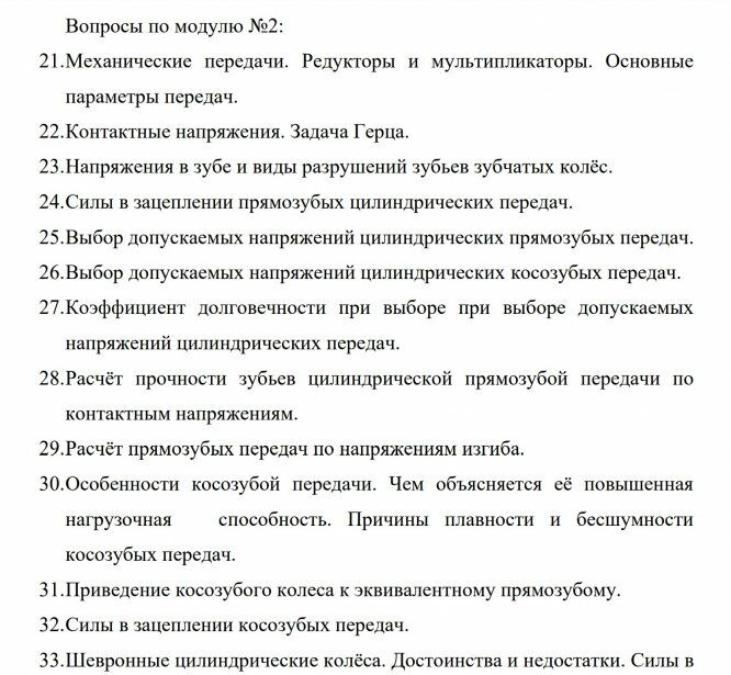 18.Расчет передачи «винт-гайка» скольжения. 19.Шпоночные соединения. Назначение и расчет соединений призматическими шпонками. 20.Шлицевые соединения. Вопросы по модулю №2: 21.Механические передачи. Редукторы и мультипликаторы. Основные параметры передач. 22.Контактные напряжения. Задача Герца. 23.Напряжения в зубе и виды разрушений зубьев зубчатых колёс. 24.Силы в зацеплении прямозубых цилиндрических передач. 25.Выбор допускаемых напряжений цилиндрических прямозубых передач. 26.Выбор допускаемых напряжений цилиндрических косозубых передач. 27.Коэффициент долговечности при выборе при выборе допускаемых напряжений цилиндрических передач. 28.Расчёт прочности зубьев цилиндрической прямозубой передачи по контактным напряжениям.