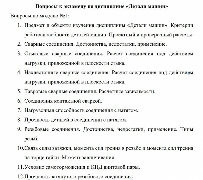 Вопросы к экзамену по дисциплине «Детали машин» Вопросы по модулю №1: 1. Предмет и объекты изучения дисциплины «Детали машин». Критерии работоспособности деталей машин. Проектный и проверочный расчеты. 2. Сварные соединения. Достоинства, недостатки, применение. 3. Стыковые сварные соединения. Расчет соединения под действием нагрузки, приложенной в плоскости стыка. 4. Нахлесточные сварные соединения. Расчет соединения под действием нагрузки, приложенной в плоскости стыка. 5. Тавровые сварные соединения. Расчетные зависимости. 6. Соединения контактной сваркой. 7. Нагрузочная способность соединения с натягом. 8. Прочность деталей в соединении с натягом. 9. Резьбовые соединения.