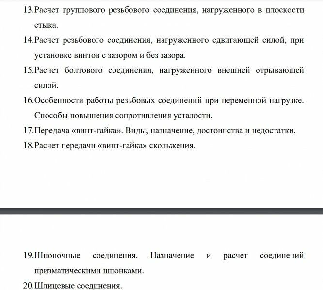 Достоинства, недостатки, применение. Типы резьб. 10.Связь силы затяжки, момента сил трения в резьбе и момента сил трения на торце гайки. Момент завинчивания. 11.Условие самоторможения и КПД винтовой пары. 12.Прочность затянутого резьбового соединения. 13.Расчет группового резьбового соединения, нагруженного в плоскости стыка. 14.Расчет резьбового соединения, нагруженного сдвигающей силой, при установке винтов с зазором и без зазора. 15.Расчет болтового соединения, нагруженного внешней отрывающей силой. 16.Особенности работы резьбовых соединений при переменной нагрузке. Способы повышения сопротивления усталости. 17.Передача «винт-гайка». Виды, назначение, достоинства и недостатки.