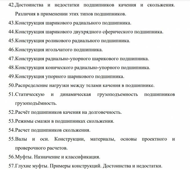 48.Конструкция конического радиально-упорного подшипника. 49.Конструкция упорного шарикового подшипника. 50.Распределение нагрузки между телами качения в подшипнике. 51.Статическую и динамическая грузоподъемность подшипников грузоподъёмность. 52.Расчёт подшипников качения на долговечность. 53.Режимы смазки в подшипниках скольжения. 54.Расчет подшипников скольжения. 55.Валы и оси. Конструкции, материалы, основы проектного и проверочного расчетов. 56.Муфты. Назначение и классификация. 57.Глухие муфты. Примеры конструкций. Достоинства и недостатки. 58.Виды несоосностей валов. Компенсирующие муфты: назначение, виды, пример конструкции. 59.Предохранительные муфты.